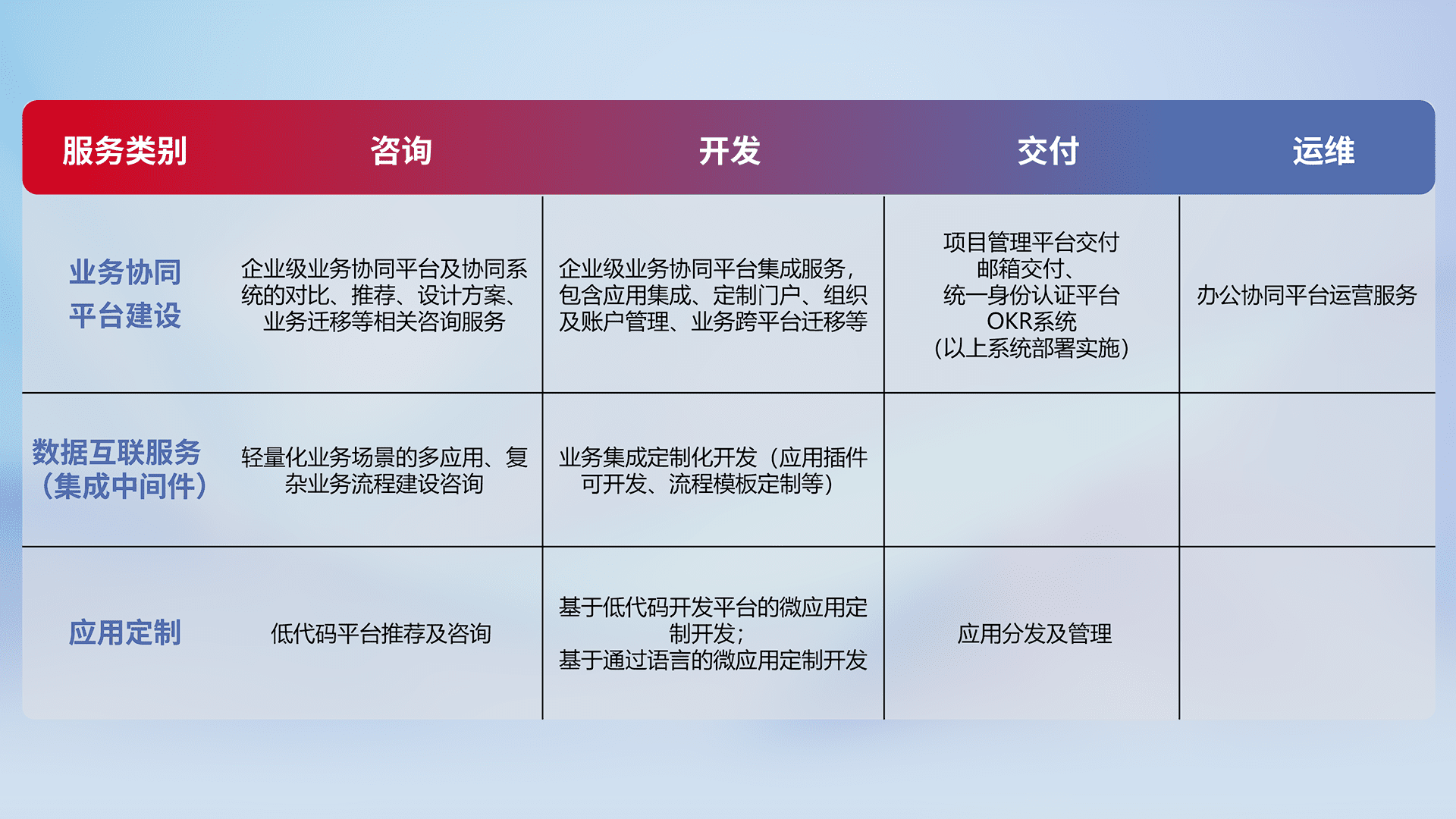 针对钉钉、、企微、、、、IDaas等平台级产品提供产品的规划、、方案、、、交付、、定制化开发等服务,,,实现如统一协同办公、、智能客户服务、、、混合会议管理、、、智能数据查询、、、、等业务场景,,,实现数字化转型。。