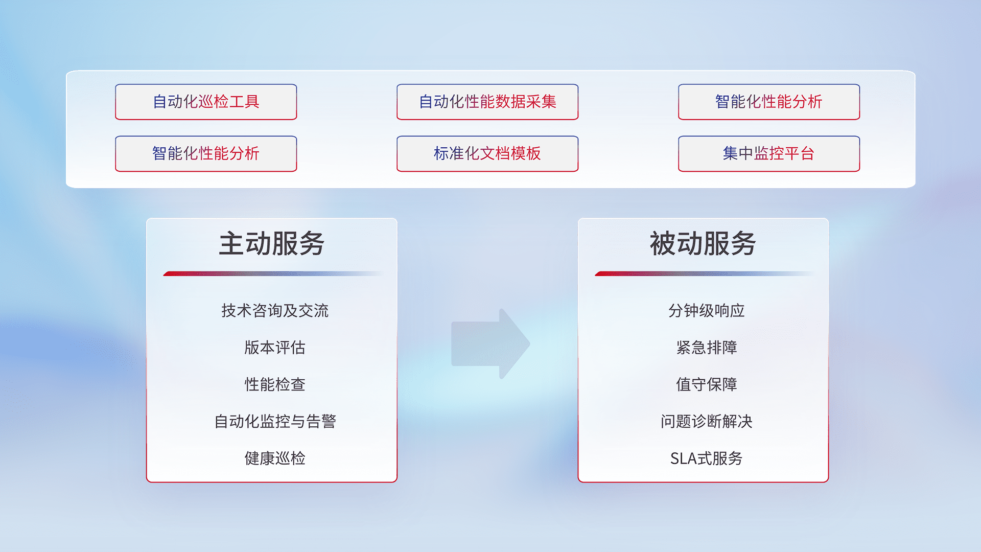 智能化工具和标准化文档,,,保障服务质量,,,提供主动服务(包含技术咨询、、、、版本评估、、、、性能检查、、自动化监控与告警、、健康巡检)和被动服务包含(分钟级响应、、、紧急排障、、、、值守保障、、、问题诊断解决、、、、SLA服务)。。。。